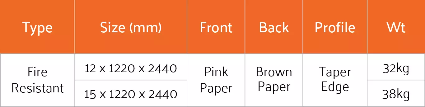EASTBERG GM Fire Resistant Boards come in 4ft x 8ft (1220mm x 2440mm) sizes with 12mm or 15mm thickness. They have a pink front paper and a brown back paper with a taper edge profile.