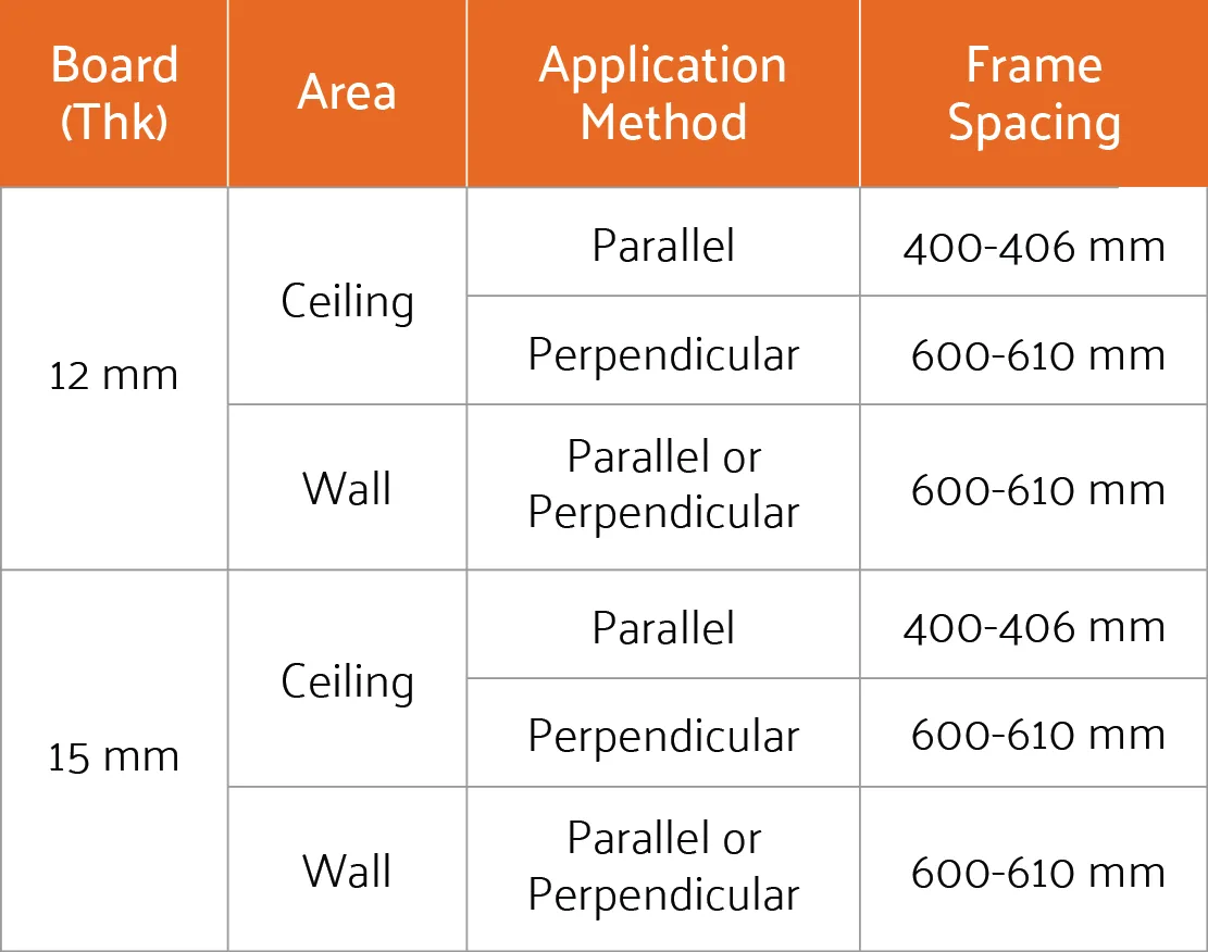 Follow recommended frame spacing for ceiling and wall based on the thickness of the board and the application method, with the board either perpendicular or parallel to the frames.