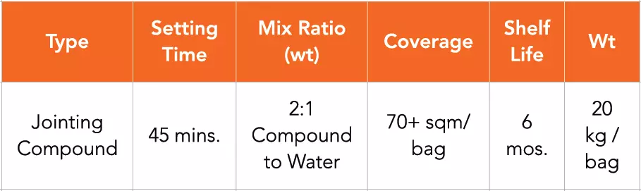 2. Mix Ratio is 2 : 1 (Jointing Compound to water) by weight.