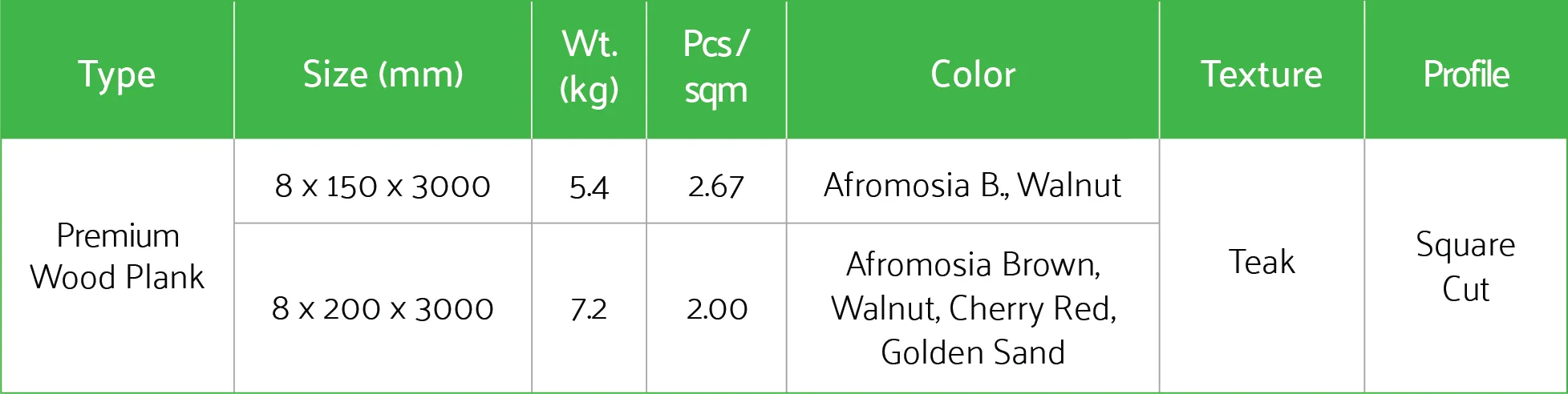 GARDNER TPI Premium Planks come in 150mm and 200mm widths x 3000mm lengths with 8mm thickness. Premium Planks are available in Teak textures and the following colors: Afromosia Brown, Walnut, Cherry Red, and Golden Sand.