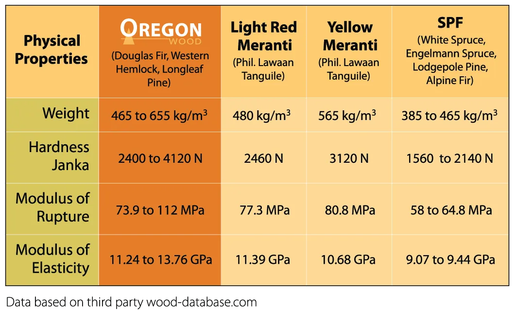 Oregon Wood is a construction select grade timber. It is comparable to Lawaan in its weight, hardness, and structural strength such as Modulus of Rupture (MOR) and Modulus of Elasticity (MOE).
